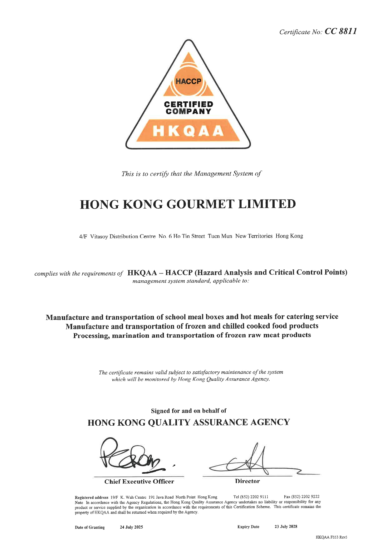 The factory of Hong Kong Gourmet was awarded the certificates of registration of "ISO 22000:2018 & HACCP Food Safety Management Systems", which issued by British Standards Institution (BSI). The certificates proved that our food quality and production equipment had reached the internationally recognized level, and certify our well management on food safety, quality monitoring, talent training, hazard analysis, etc.